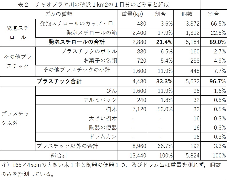 (表1、%は、プラスチックの総数、総容積の中に占める割合)。