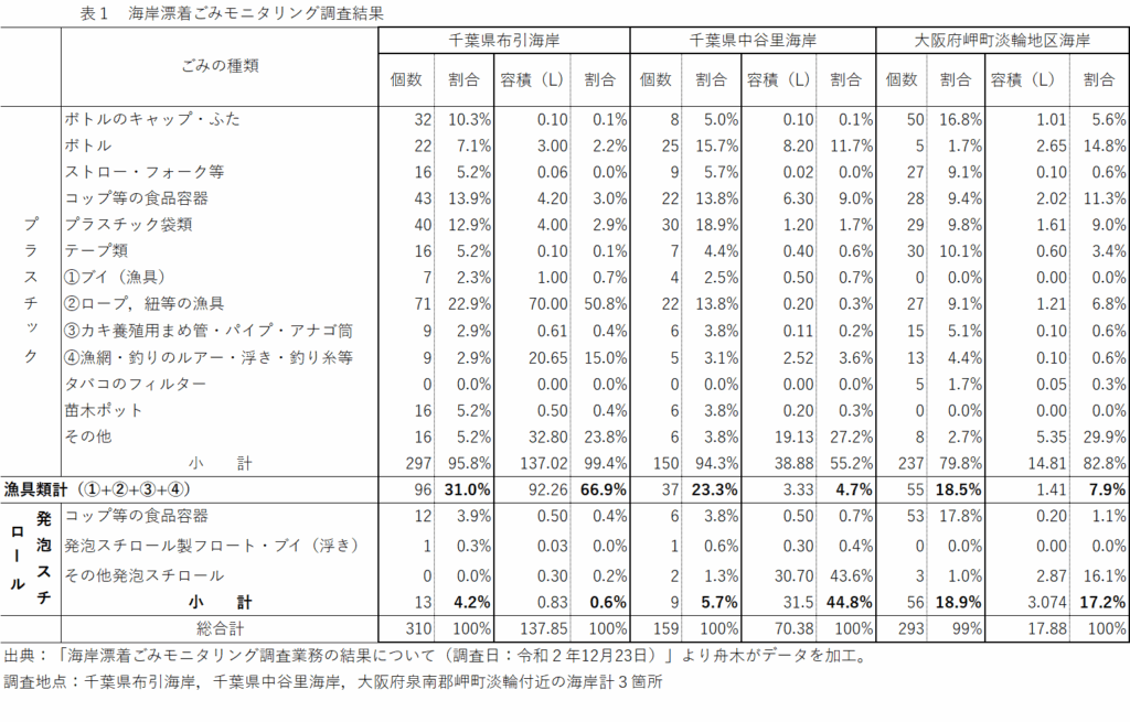 2)環境省:千葉県、大阪府:海岸漂着ごみモニタリング調査業務の結果について(2020)