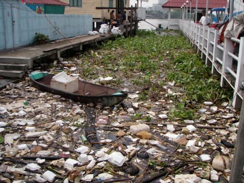 プが普及していた。それまでは、市場で買い物をすると、バナナの皮等で包んでいたが、今ではバナナの皮は全く使われていない。イベントの後の地面は、プラスチック袋、発泡スチロールの皿等で覆われてしまうほどである。このような状態のため、町の中を流れる排水路の行く先であり、さらに川につながっている運河には大量の発泡スチロールが浮遊していた(下の写真3)。運河の流れ先であるチャオプラヤ川の砂浜漂着するごみを調べた結果では、発泡スチロールは重量で全ごみの約2割、個数で約9割を占めていた。3)